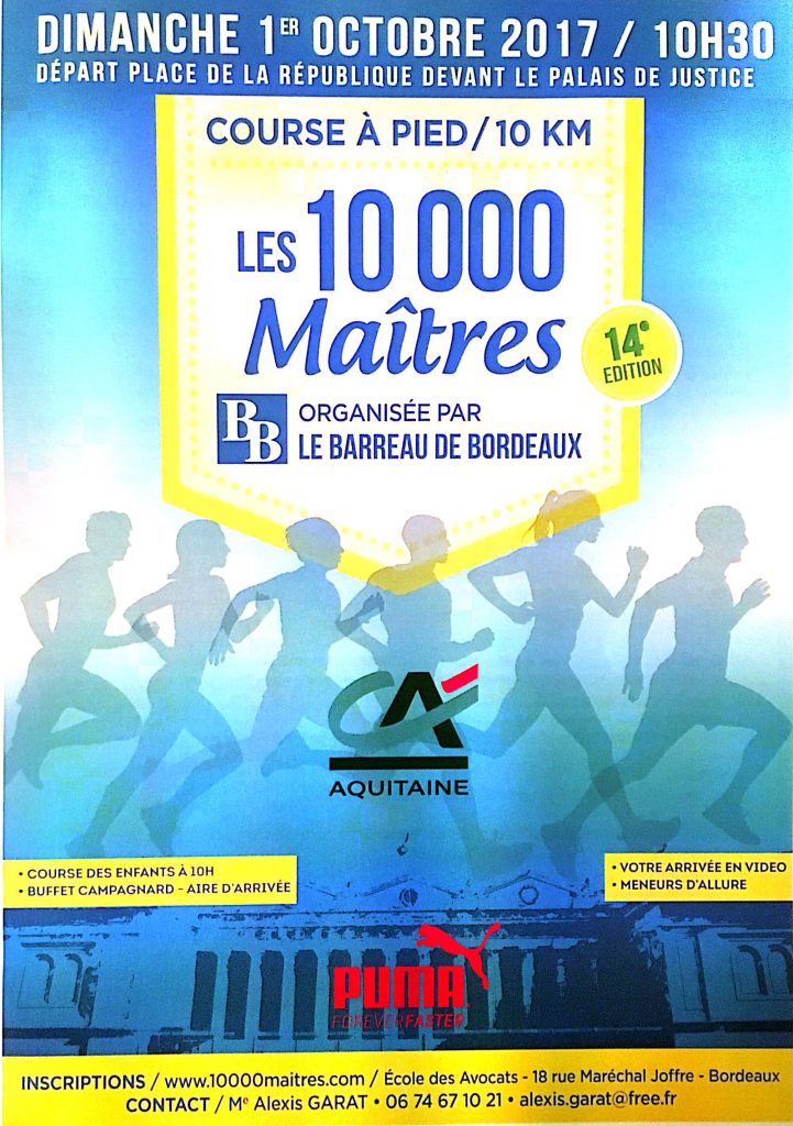 Préparez vos baskets ! Dimanche 1er Octobre 2017 à 10h30, rendez-vous place de la République pour les 10 000 Maîtres, course organisée par la barreau de...